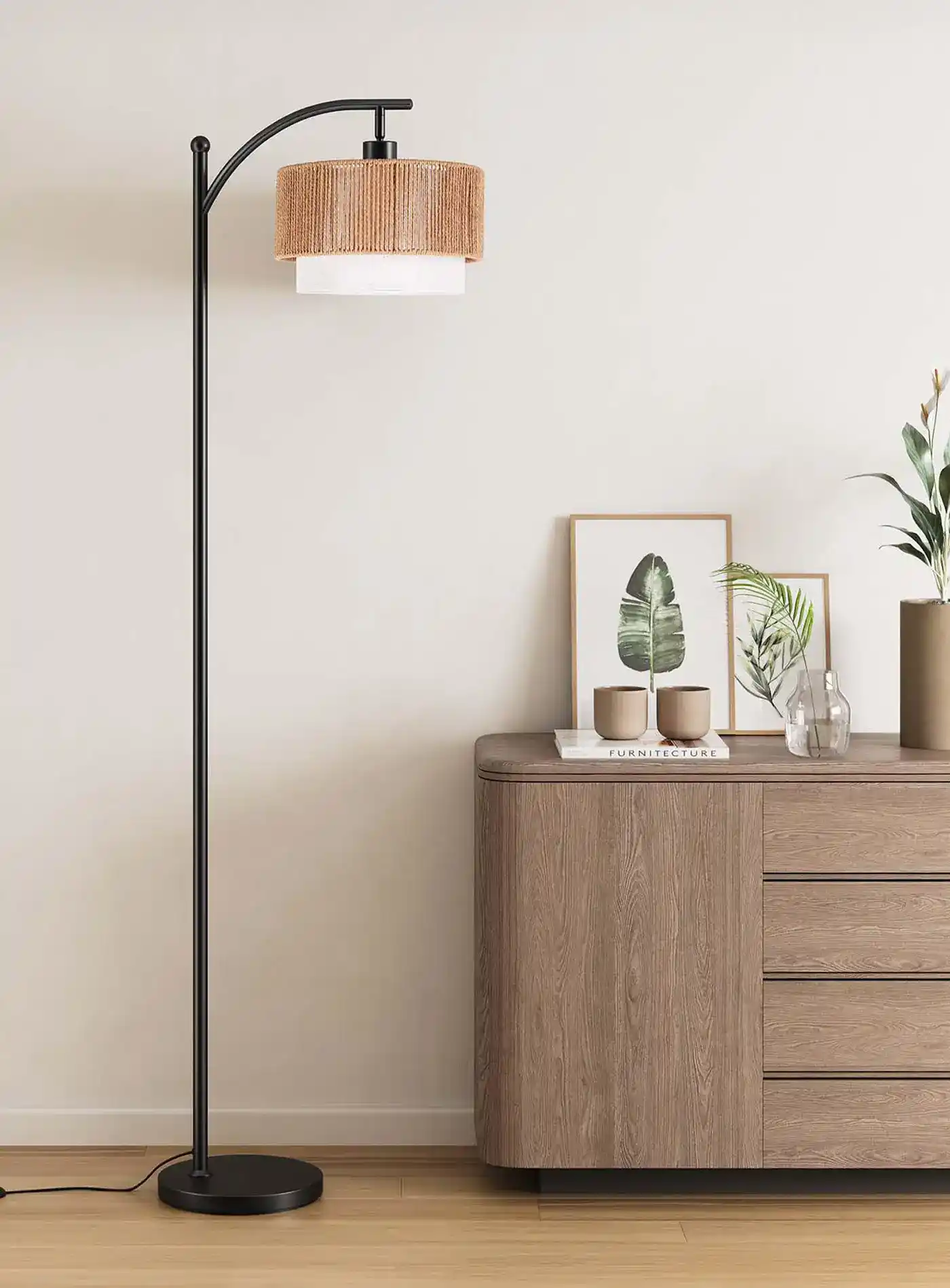 A modern arc floor lamp with rattan charm and fabric softness. Features 3-color LED lighting, adjustable angles, two interchangeable shades, and a sturdy base for safe, cozy living.